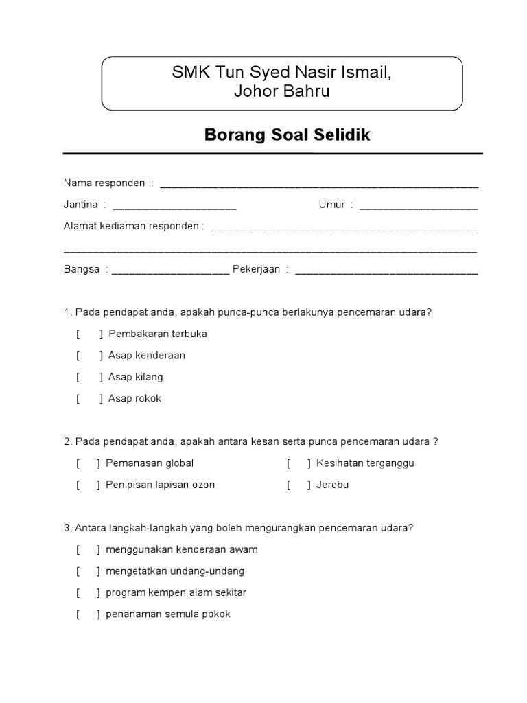 Contoh Borang Soal Selidik Pencemaran Udara Geografi Pt3 Pdf